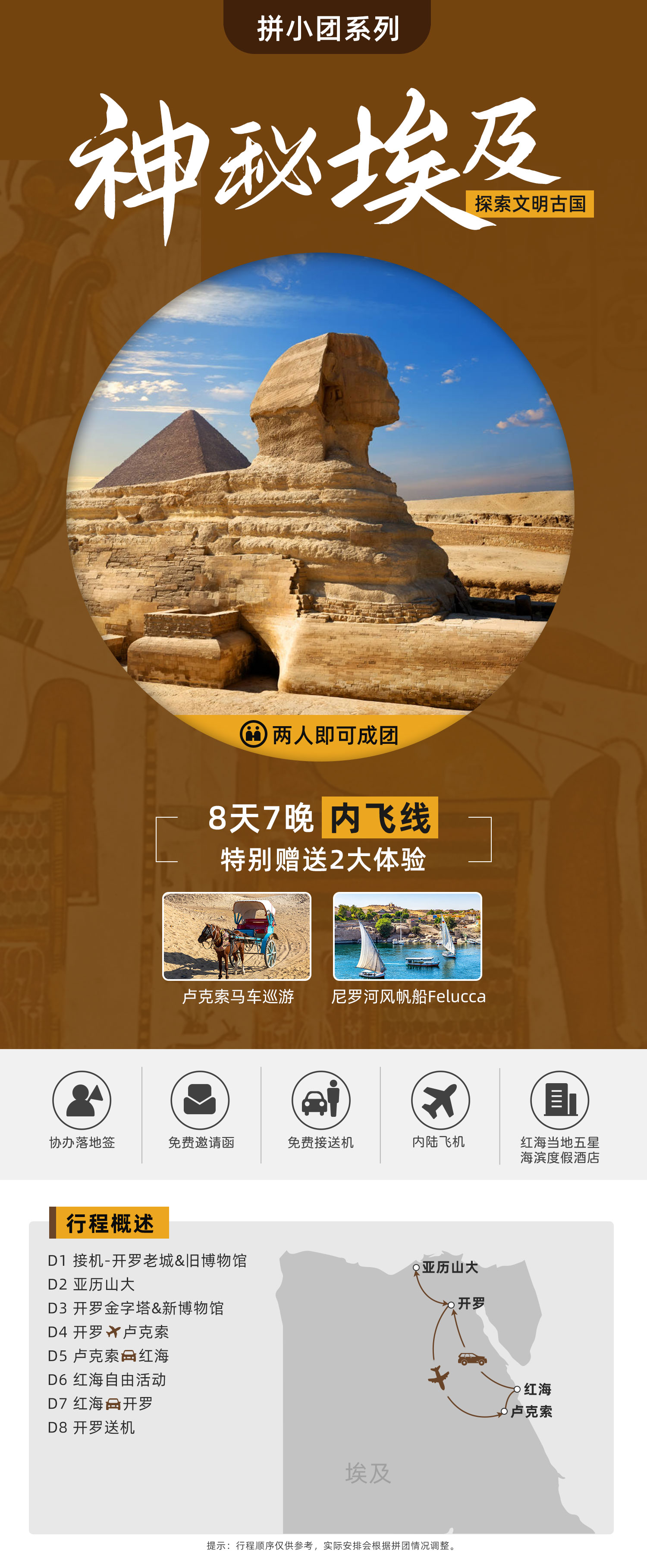 路线名称:<拼小团>【内飞线】埃及开罗+红海+卢克索+亚历山大8日游(落地签)